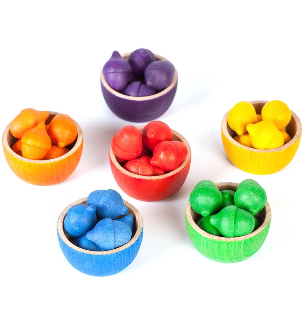 Dieses wunderschöne Grapat-Set aus hochwertigem Massivholz ist ein echter Klassiker. Es besteht aus 6 Schälchen, 36 Eicheln in den für Grapat typischen Regenbogenfarben sowie einer Holzzange. Wie bei allen Grapat-Spielzeugen bieten sich im freien Spiel unzählige Einsatzmöglichkeiten: Die Eicheln lassen z.B. farblich den Schälchen zuordnen, in unterschiedliche Mengen aufteilen oder unter den Schälchen verstecken. Durch die Verwendung der Holzzange wird die Geschicklichkeit und Feinmotorik gefördert und anhand der 36 Holzeicheln lässt sich spielerisch ein erstes mathematisches Grundverständnis entwickeln.