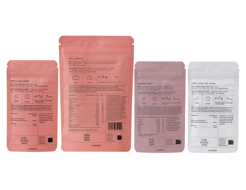 Lieferumfang: 1x Postnatal Boost,2x Omega 3-Kapseln, 1 x Daily Essential Pulver