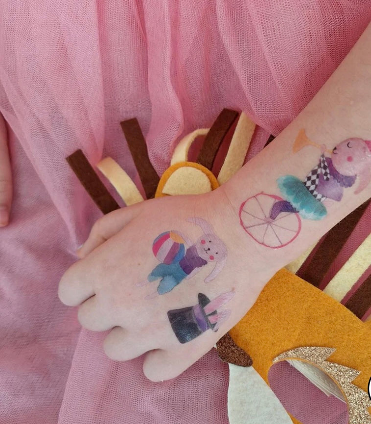 Unsere Zirkushasen Tattoos für alle Mädchen und Jungen, die es bunt mögen, Hasen und oder den Zirkus lieben oder vielleicht selbst kleine Akrobaten sind.